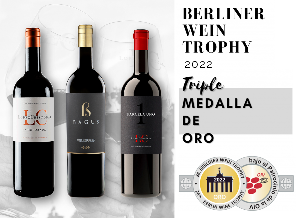 Tres de nuestros grandes vinos, Bagús, LC Parcela Uno y LC Crianza “La Colorada”, han sido galardonados con la medalla de oro en la última edición del Berliner Wein Trophy, uno de los concursos más prestigiosos del mundo que se celebra en Alemania, cuyo patrocinio corre a cargo de la Organización Internacional de la Viña y el Vino (OIV) y la Unión Internacional de Enólogos (UIOE).